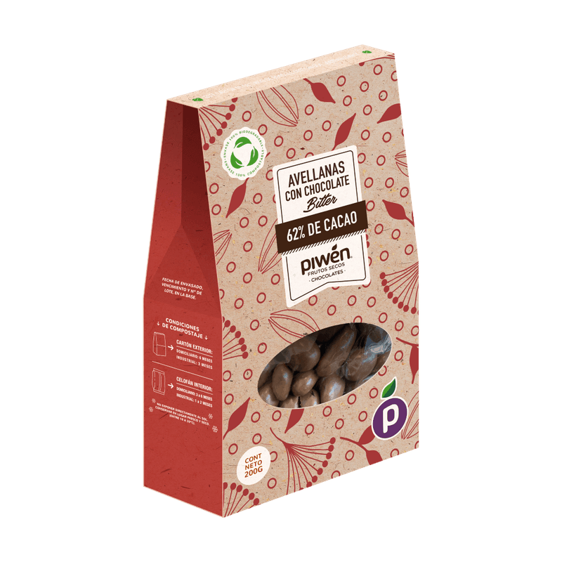 Beneficios Nutricionales: Selección de avellanas europeas enteras bañadas en una capa de chocolate Bitter, 62% cacao, un snack perfecto para los amantes de los frutos secos y el chocolate.